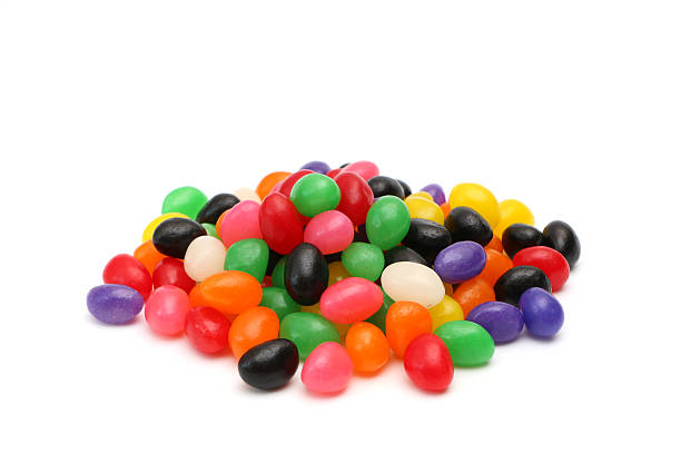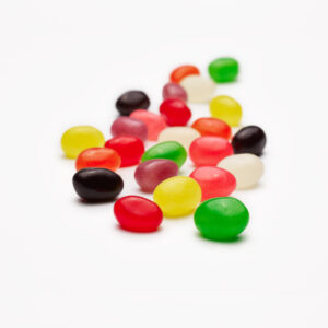 Appearance: Colorful bean-shaped candies in a vibrant rainbow mix.